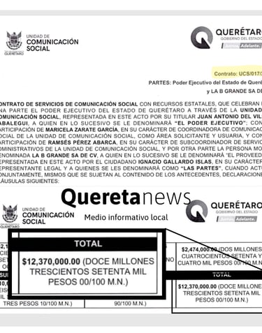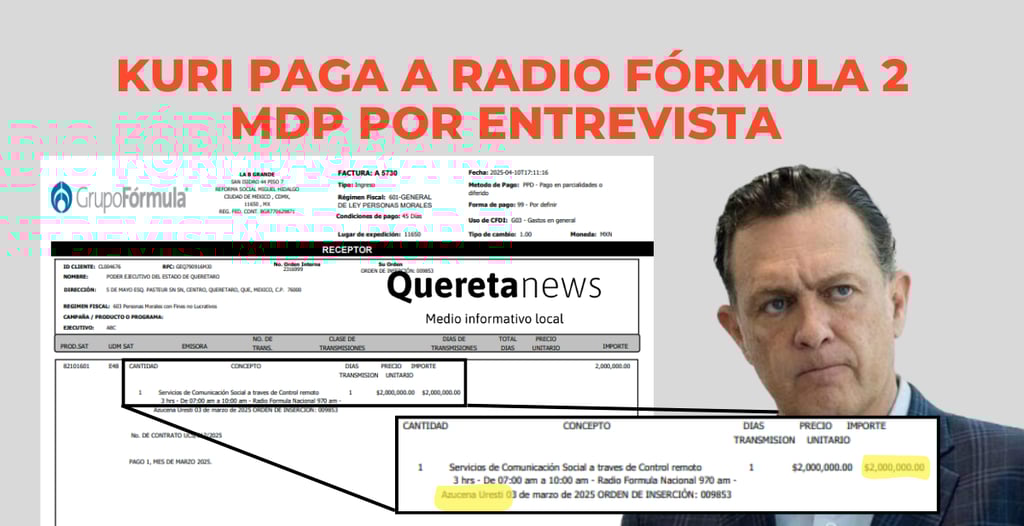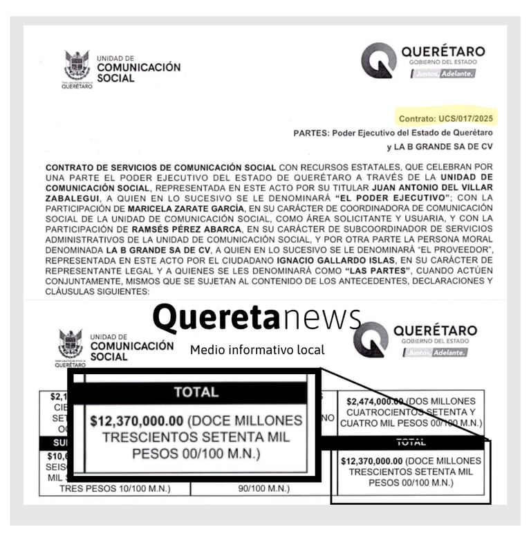 Mediante el contrato UCS/017/2025, fechado el 17 de enero de 2025, el Poder Ejecutivo del Estado de Querétaro contrató a Radio Fórmula, a través de la empresa “B Grande S.A. de C.V.”, para supuestos “servicios de comunicación social” en radio nacional, por la escandalosa cantidad de $12,370,000.00 pesos.