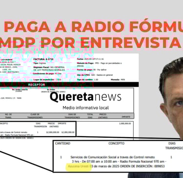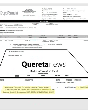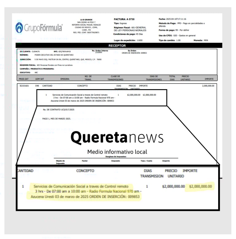 Lo más grave se encuentra en los anexos del contrato: la factura A 5730, que acredita un pago de $2,320,000.00 pesos del dinero de las y los queretanos, solo por un día de transmisión, el 3 de marzo de 2025, en Radio Fórmula Nacional 970 AM, dentro del noticiero conducido por Azucena Uresti.